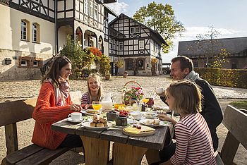 Sich frühmorgens vom Krähen der Hähne wecken lassen und ein ausgiebiges Thüringer Landfrühstück mit frischen Produkten vom Hof und aus der Region genießen – das ist echter Urlaub. Jeden Tag wartet ein neues Abenteuer: Tiere streicheln und füttern, mit dem Traktor mitfahren, viel Platz zum Spielen und Toben. Und die Eltern können mal wieder richtig entspannen und die Seele baumeln lassen.