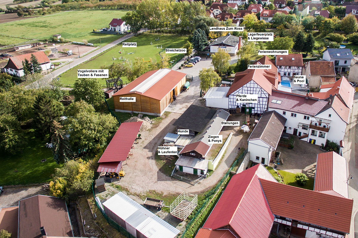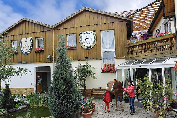 Mehr InformationenHier wird Gastfreundschaft groß geschrieben. Unser Hof befindet sich am Ortsrand, eingebettet von Reit- Bolz- und Spielplatz. Hier spazieren Gänse, Hühner und Katzen, die ebenso wie die Ziegen und Kaninchen gestreichelt, gefüttert und gepflegt werden wollen. Pferde und Ponnys laden zum Ausritt oder in die Reithalle ein. Zum Schlemmen nach Hausfrauenart und zum Feiern (bis 120 Personen) bietet unser Landhaus das geeignete Ambiente. Vielfältige Freizeitmöglichkeiten wie Grillabende, Kutsch- und Planwagenfahrten, relaxen in der Sauna oder schwimmen im Pool, Reitunterricht, Tischtennistuniere, Lagerfeuer u.v.a. lassen keine Langeweile aufkommen.