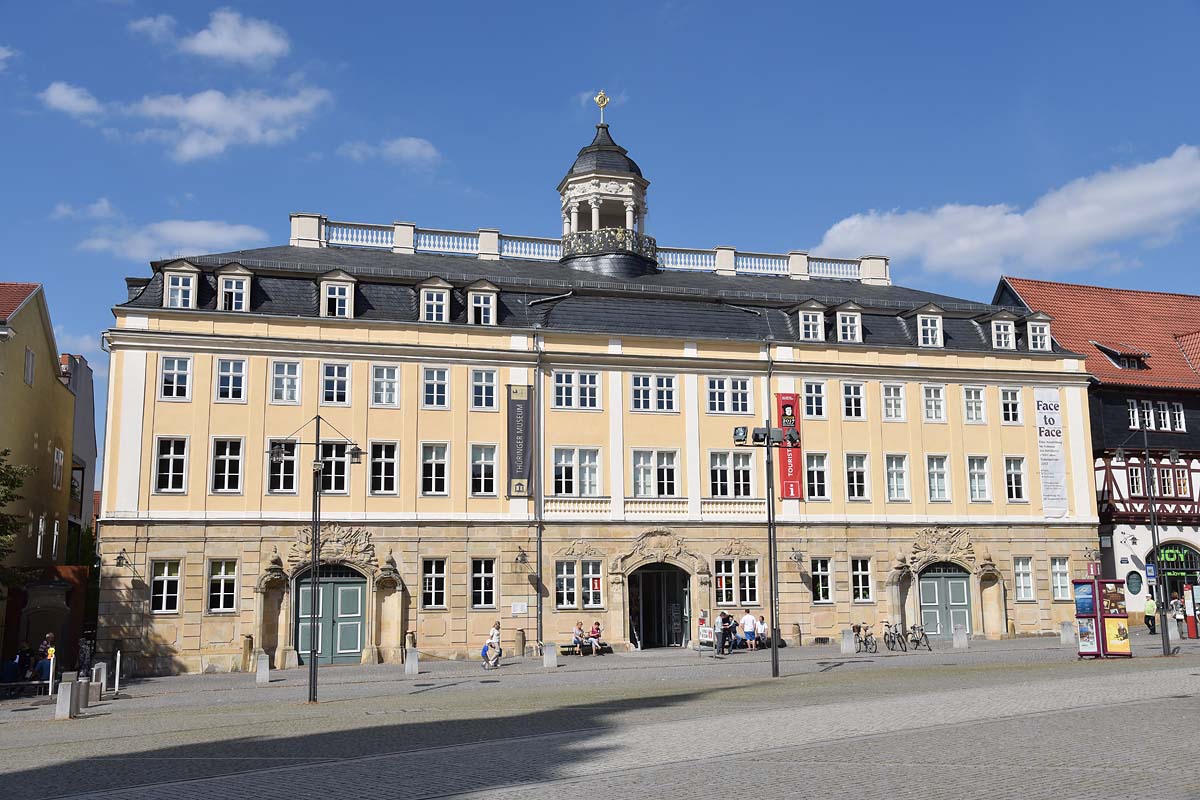 Spätbarockes Stadtschloss, ab 1742 von Landbaumeister Gottfried Heinrich Krohne im Auftrage Herzogs Ernst August von Sachsen-Weimar und Eisenach erbaut, mit Sammlungen aus Malerei, Grafik, Volkskunde und Kunsthandwerk, vor allem Fayencen, Glas und Porzellan aus Thüringen.