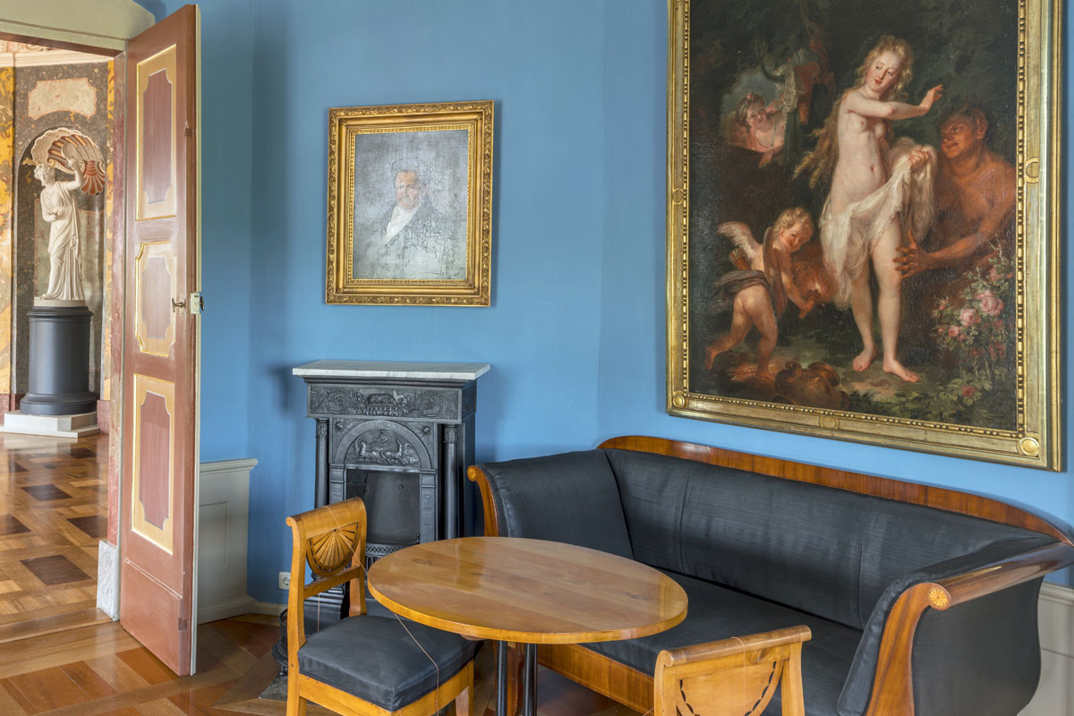 Durch Fürst Günther beauftragter Festsaal im 1. Obergeschoss des Westflügels, dessen Raumhöhe über zwei Etagen reicht. Der Saal ist im Rokokostil ausgeführt. An den Längsseiten ist der Blaue Saal mit Emporen, an den Schmalseiten mit über Nischen angeordneten ovalen Gemälden (über der Eingangstür: Mars mit Venus, an der gegenüberliegenden Wand Bacchus und Ariadne) ausgestattet. Seine Farbfassung erhielt er wohl in Anlehnung an die Schwarzburgischen Landesfarben Blau und Weiß.