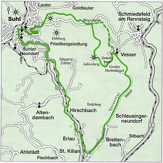 Suhl - Himmelreich - Wegscheide - Adlersberg - Stutenhaus - Vesser - Breitenbach - Erlau - Hirschbach - Friedberg - Suhl