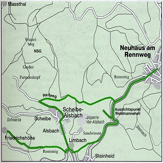 Neuhaus am Rennweg - auf dem Rennsteig mit Abstecher zum Aussichtspunkt Weidmannsheil - bis Sandwieschen - Arbeitsdienstweg bis Limbach - Friedrichshöhe - zurück bis Scheibe- Alsbach - neue Gebirgsstraße in Richtung Goldisthal, rechts abbiegen auf Reifweg nach Neuhaus am Rennweg