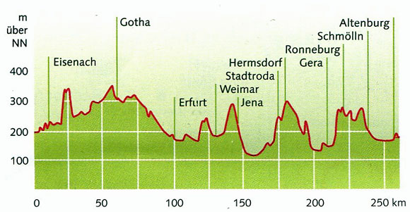 Die Skatstadt Altenburg ist Start oder Ziel dieser 225 km langen Tour quer durch Thüringen bis Eisenach. Über Schmölln und Gera gelangen Sie nach Bad Köstritz, Bad Klosterlausnitz und weiter nach Jena. Mit dem Ort verbinden sich die Namen von Goethe, Schiller, Napoleon, Zeiss und Abbe. Besuchen Sie hier das älteste Planetarium der Welt. Danach geht es weiter in die "Klassiker-Stadt" Weimar. Goethe und Schiller, Bach, Liszt und Cranach haben hier gelebt und gewirkt.