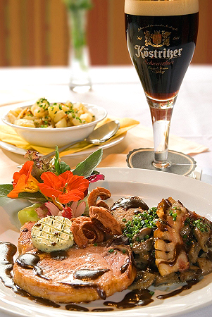 120 g Pellkartoffeln; 20 g geräucherter Bauspeck; Papsöl; 1 kleine Zwiebel; 160 g Kasslerkotelett; 60 g Schweinefilet; 1 kleines Würstchen; 60 g Hackfleisch; 100 g Champignons; 50 ml Sahne; Salz, Pfeffer; 20 g Kräuterbutter; Petersilie oder Schnittlauch