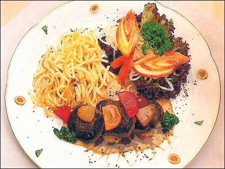 Apfel-Selleriesalat: 1 kl. Kopf Sellerie, 1/2 Apfel, 1 cl Olivenöl, 2 cl Kräuteressig, 2 cl trockenen Weißwein, Zucker, Salz, weißen Pfeffer
