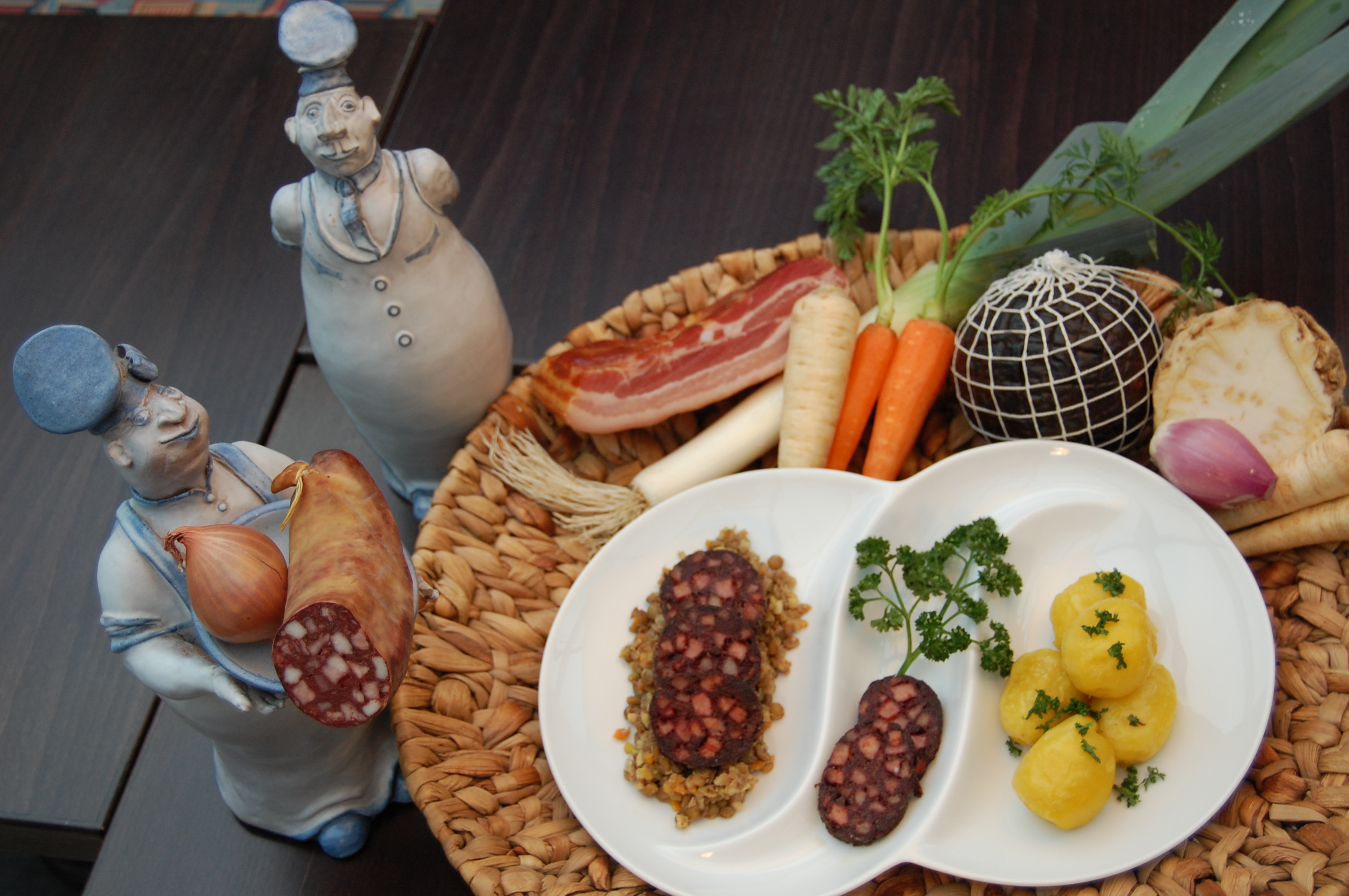 Zum Speckfett gibt man das Speiseöl und erhitzt beides zusammen. Die in fingerdicke Scheiben geschnittene Blutwurst wendet man im Weizenmehl und brät sie beidseitig im heißen Fett. Die Blutwurstscheiben sollten eine schöne krosse Oberfläche haben. Vorsichtig werden sie dann auf dem Linsengemüse arrangiert.