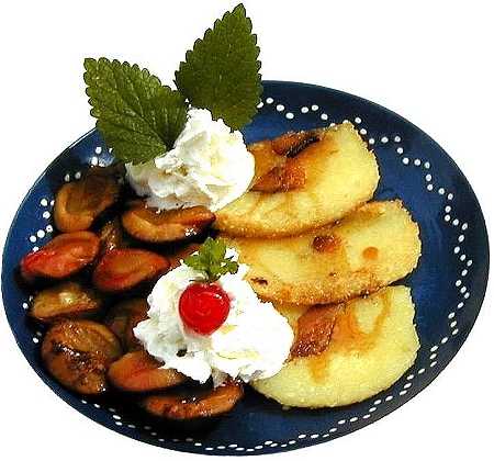 In der Zwischenzeit wird in einer Kasserolle etwas Butter erhitzt, und halbierte Pflaumen hinzugegeben. Diese werden mit Zimt und Zucker abgeschmeckt. Zur Verfeinerung wird das Ganze mit etwas Pflaumengeist abgelöscht. Die karamelisierten Kloßscheiben, in einem Fächer, auf einem Teller anrichten, mit etwas Zuckerfond übergießen. Die heißen Pflaumen neben den Kartoffelscheiben anrichten und mit einer kleinen Sahnedekoration versehen.