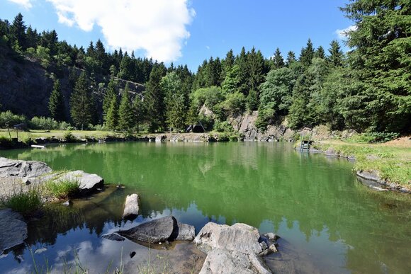 Geheimtipp: Hinter der Ortschaft Floh-Seligenthal befindet sich der Bergsee Ebertswiese. Umgeben von bis zu 30 Meter hohen Klippen ist er die perfekte Abkühlung nach einer längeren Autofahrt im Sommer.