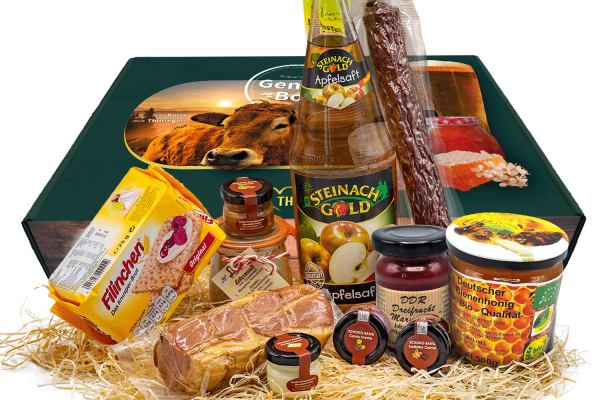 Inhalt: 1L Apfelsaft von Steinach Gold, Deutscher Bienenhonig in Bio-Qualität, "DDR Dreifrucht Marmelade" - Aufstrich, Schokobang 4er Set von der Goethe Chocolaterie aus Oldisleben, 180g Mangalitza-Leberwurst von der Landfleischerei Lindig aus Dobian, 200g Rennsteigsalami von Naturfleisch GmbH Rennsteig aus Oberweißbach, Bauernschinken am Stück von Naturfleisch GmbH Rennsteig aus Oberweißbach, 75g Filinchen Orginal von Gutena aus Apolda