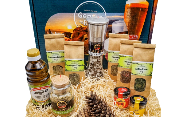 Inhalt: Black & White Mühle, Olivenöl, Thüringer Thymian, Lorbeer-Blätter, Gewürzsalz Mediterran, Rühreigewürz, Dillspitzen grün, Liebstöckel gerebelt, Kümmel ganz, Steak Marinade "Lieblingsobst Steak" Mini Glas