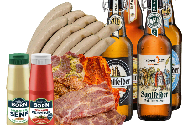 Inhalt: BORN Tomaten-Ketchup 300ml Squeezer-Flasche, Born Delikatess-Senf - mittelscharf, Original Thüringer Bratwurst - gebrüht, 5er-Pack a 100 g, Schweinenackensteak "S-Steak Strassbourg", Schweinenackensteak "S-Steak Budapest", Schweinenackensteak "Rostbrätel fertig gewürzt", Schweinenackensteak "Rennsteigbrätel", Jubiläumsbier - 500 Jahre Bauernkrieg, Ur-Saalfelder, Saalfelder "Premium-Pilsener", Hell - Saalfelder Bier