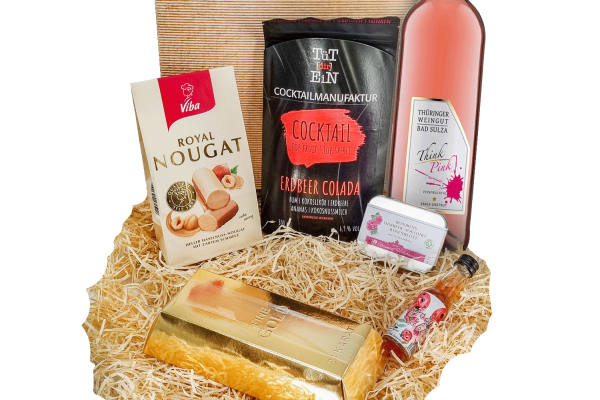 Inhalt: Think Pink - Rotling, Goldbarren von Viba Sweets, Bonbons - Himbeere-Joghurt-Rosenblüte, Erdbeer Colada Cocktail von Tüt [dir] ein, Royal Nougat Beutel, Mutschekübchen - Pfirsichlikör
