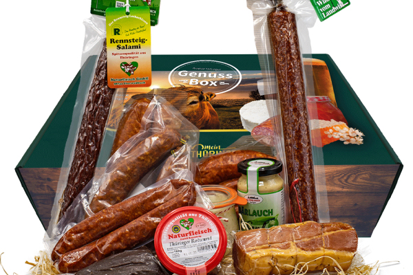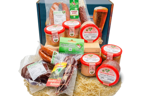 Inhalt: Produkte von der Naturfleisch GmbH Rennsteig aus Oberweißbach: 180g Original Thüringer Rotwurst, Bauernknackwurst im Ring, Hausmacher Knacker im Paar, Limousin-Rinderschinken am Stück sowie Leberwurst im Glas, Eisbein in Aspik im Glas, Schneekopf-Salami, Rinder-Salami, Jagdwurst im Glas, Soljanka im Glas, Mett im Glas