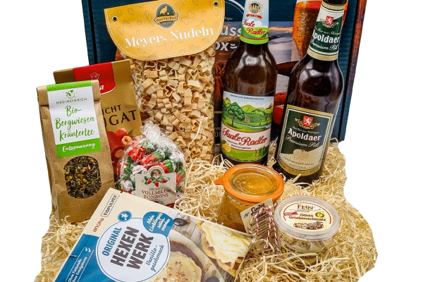 Inhalt: Apoldaer "Premium Pils", Saale-Radler naturtrüb, Wachtelnudeln - Herzen, Schicht-Nougat Röllchen, Bio Bergwiesen-Kräutertee "Entspannung", HEXENWerk Vanille - für kreative Eisideen, Omas Griebenschmalz, Rillettes vom Eichelschwein, Erdbeer-BonBon