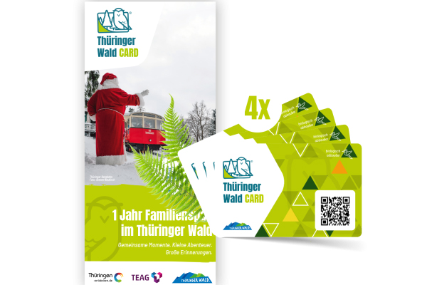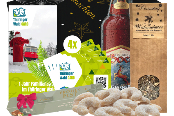 Das Paket enthält 4 Thüringer Wald Cards für Erwachsene in einer weihnachtlich gestalteten Geschenkhülle. Die Karten sind ab Kauf 365 Tage gültig und können bei allen Partnern mehrmals eingesetzt werden. Je Erwachsenen-Karte ist ein Kind bis 12 Jahren inklusive.