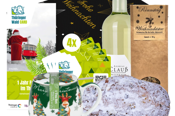 Inhalt: 4x Thüringer Wald Card in Geschenkbox, 600g Thüringer Stollen - Meisterbäcker Scherf, Glühwein -weiß- Weingut Bad Sulza, Tea for you - Merry Christmas - Weihnachtselch - Könitz Porzellan, Weihnachtstee - Kräutertee - Kulinarische Zeitreisen