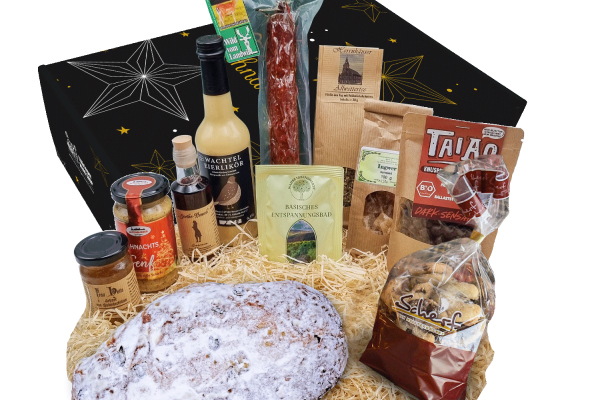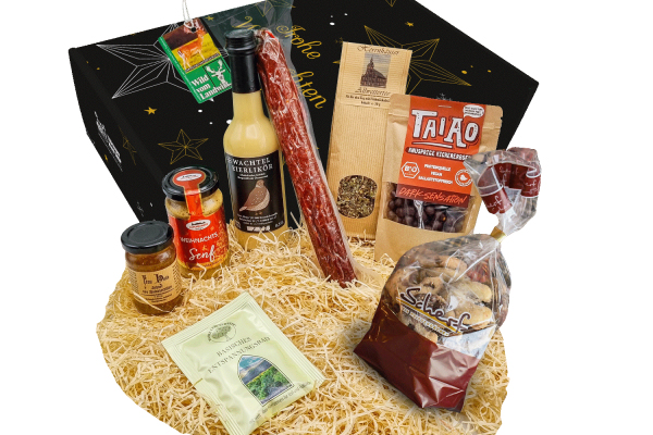 Inhalt: "Frau Holle" Schnee von Holunderblüten - Aufstrich, Herrnhäuser Allwettertee, Damwild-Salami, Marmorkipferl, Weihnachtssenf süß-pikant, Wachteleier Eierlikör, Taiao - Dark Sensation, Basisches Entspannungsbad