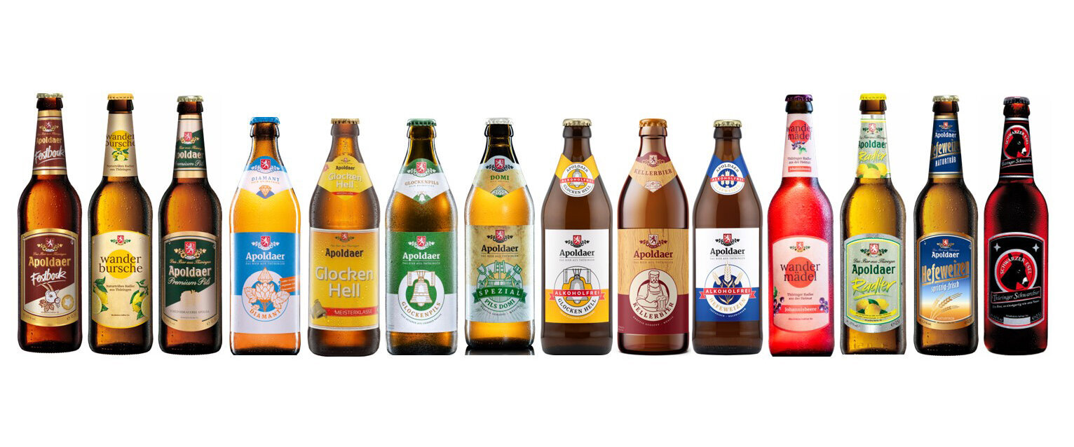 Die Vereinsbrauerei Apolda bietet 17 verschiedene Biersorten, darunter das Premium Pils, Glockenpils, Glocken Hell, Pils Spezial Domi, Hefeweizen, Wanderbursche und Wandermädel sowie unsere Schlossberg Kellerbiere in Hell, Dunkel und Stark.