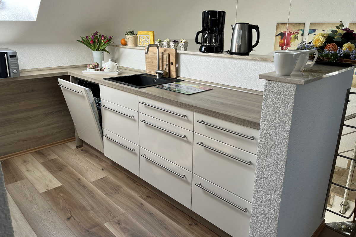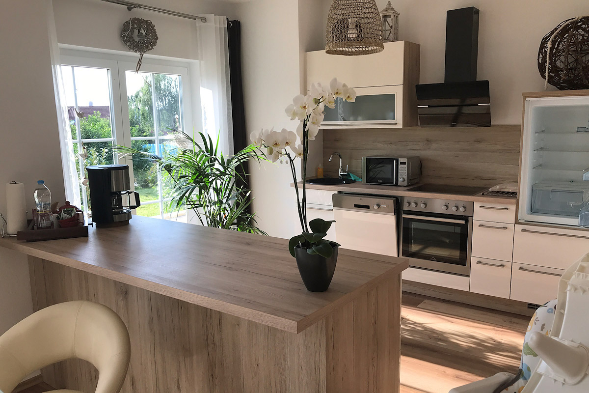 Sie verfügen jeweils über eine eigene Haustür, 2 Schlafzimmer, eine komplett eingerichtete Einbauküche mit Geschirrspüler, Mikrowelle, Eierkocher, Toaster, E-Herd, Kühlschrank sowie eigene, kostenfreie Parkplätze.