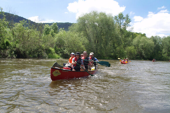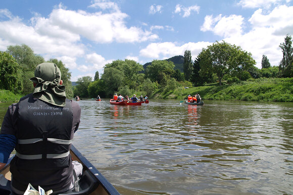Das Saaletal wird nun deutlich enger. Liebliche Talabschnitte wechseln mit schroffen Muschelkalkfelsen. Die Wasserkraftanlage in Döbritschen ermöglicht mit neuester Technik, Wasserwanderern und Fischen gleichermaßen eine problemlose Überwindung des Wehres. Bei entsprechendem Wasserstand erwartet Sie ein Kanu-Fisch-Pass (re) als abenteuerliche, aber ungefährliche Wasserrutsche. lm Anschluss können Sie sich auf dem malerisch gelegenen Rastplatz von Ihrem Abenteuer erholen, bevor wenige Flusswindungen weiter der weiße Bergfried in Camburg das Ende dieser Etappe ankündigt.