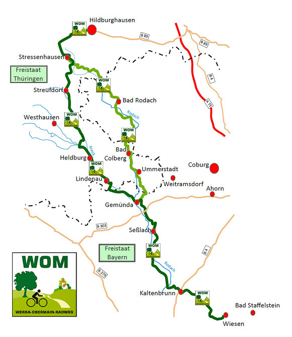 Der Weg zweigt direkt vom Werratal-Radweg am Hildburghäuser Rathaus ab und führt zum Main-Radweg in Bad Staffelstein. Von dort kann man natürlich auch weiter in Richtung Bamberg / Kulmbach / Bayreuth oder in Richtung Würzburg / Frankfurt / Wiesbaden radeln.