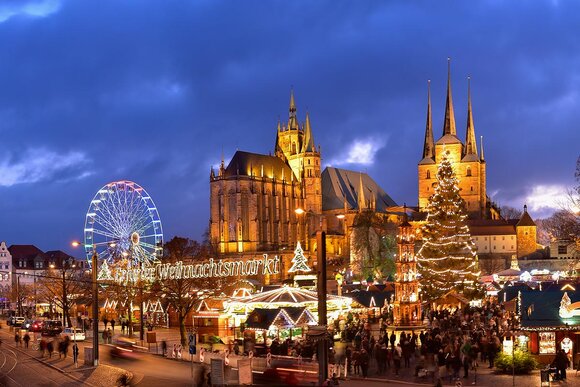 Ende November eröffnet in der Landeshauptstadt Erfurt der alljährliche Weihnachtsmarkt. Mehr als 200 Holzhütten erstrecken sich vom Domplatz bis zum Willy-Brand-Platz und bieten allerhand zu entdecken. Von kunstvollen Handwerksgegenständen über liebevoll beleuchtete Weihnachtsbäume bis hin zur typischen Thüringer Bratwurst ist für das Wohl der Besucher bestens gesorgt. Eine besondere Attraktion ist das große Riesenrad und die vielen kleinen Karussells für Kinder. Wahrzeichen des Marktes ist ein fünf Meter hoher Adventskranz auf den Stufen des Doms. Beim Anblick der festlichen geschmückten Buden wird sofort klar, wieso der Erfurter Weihnachtsmarkt als einer der schönsten Märkte Deutschlands gilt.