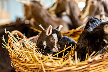 Nach dem Umbau des ehemaligen Hallenbades zum Ziegenstall war es im Jahr 2010 dann soweit - es zogen die ersten Ziegen ein. Heute umfasst der Bestand an die 80 Ziegen. Die Rasse "Thüringer Wald Ziege" ist vom Aussterben bedroht. "Jedes Jahr im zeitigen Frühjahr erblicken viele kleine Lämmer das Licht der Welt. Immer wieder ein Glücksmoment für uns." - so beschreibt Amina Hatzel dieses jährlich sich wiederholende Ereignis.